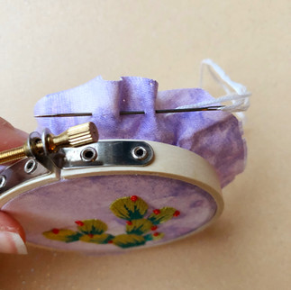 5. Using needle and thread, attach the sawtooth picture hanger to the felt. If you have a label or want to add something stitched to the back of your hoop back, now is the time to do that.