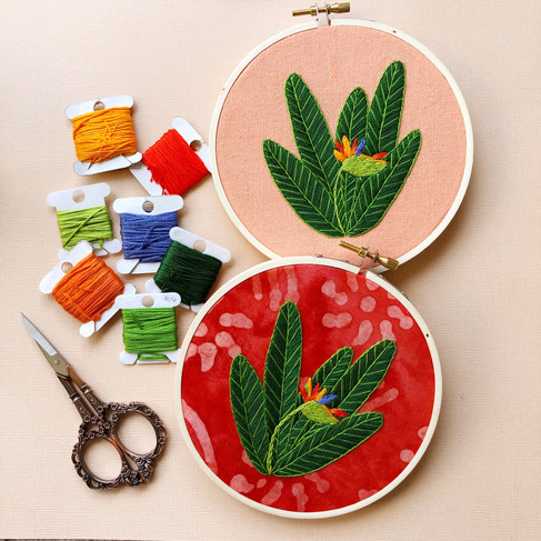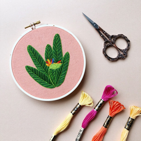 This month's Pattern Club design, captures the bold colors of tropical plants and invites you to spend time in a warm botanical locale. It's like stitching a vacation in a hoop! When you pick this pattern up, revel in the mental vacation.